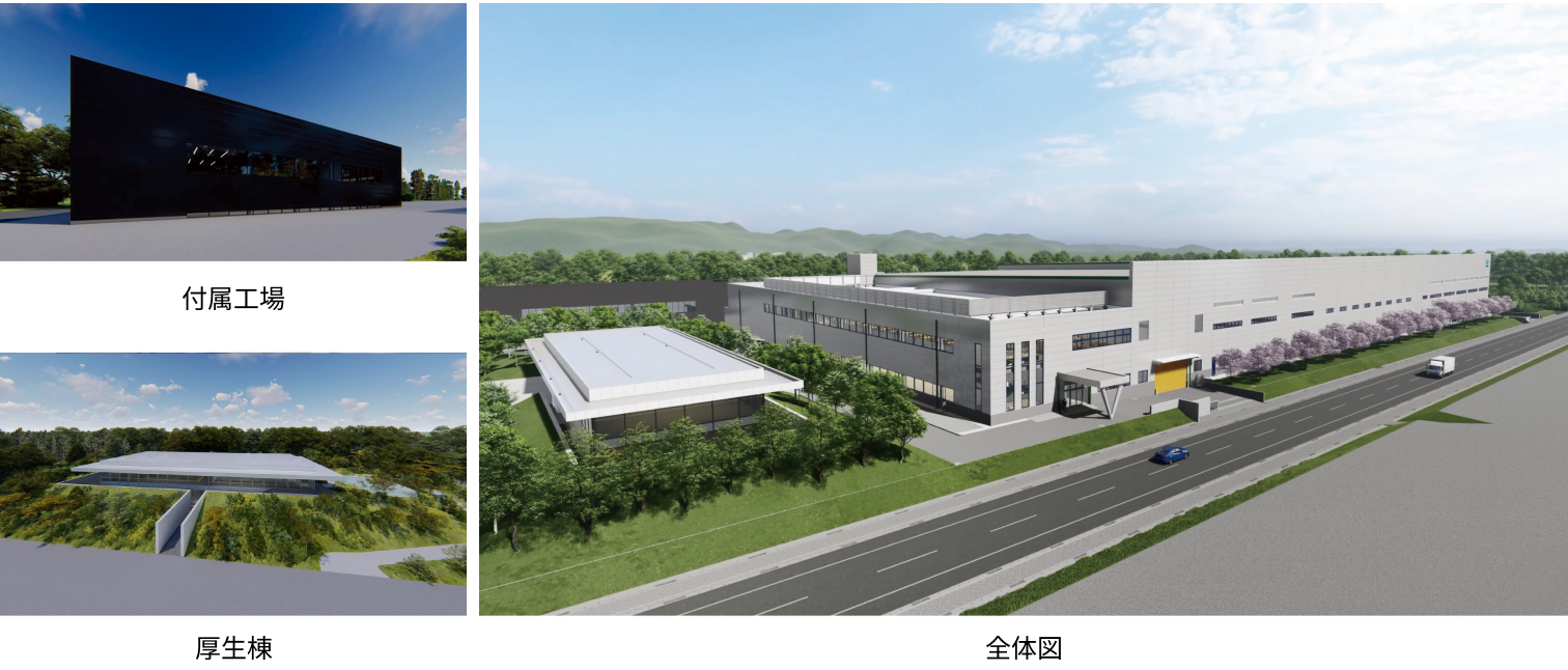 本工場は工場棟、付属工場棟、厚生棟の3棟から構成されています。また、地球環境へ配慮した設備(太陽光発電)を導入し、ZEB及びRE100の達成を目指します。