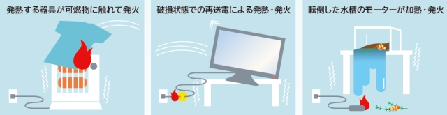 トラッキング現象とは、長期間コンセントにプラグを差し込んだままにすると、プラグ周辺にホコリがたまり、そのほこりに湿気が付着し、プラグの刃の間で微小な放電が繰り返される現象です。そのまま放置すれば、差し込みプラグの絶縁状態が悪くなり、発熱や突然の出火に至るケースもあります。夜間や不在時に発生すると発見が遅れ、思わぬ被害となることもあります。